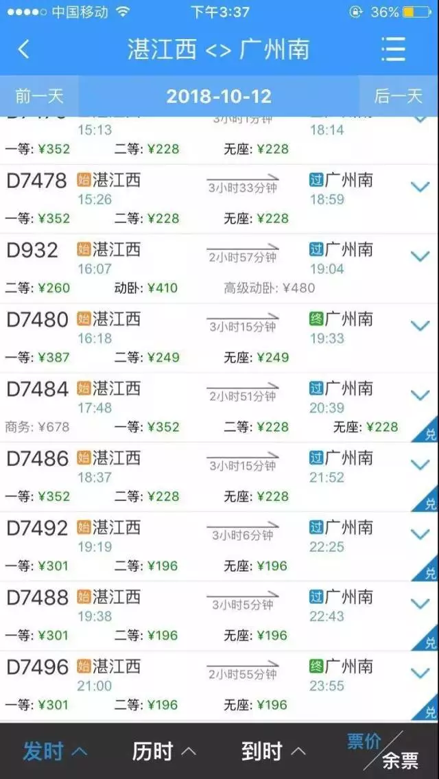 D7492(19點(diǎn)19分班次)、D7488(19點(diǎn)38分班次)、D7496次(21點(diǎn)00分)均由原來(lái)的228元調(diào)整為196元;
