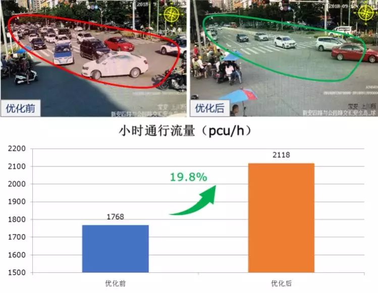 公園路為寶安中心城區(qū)主干道,為減少車車交織、改善行車秩序,9月11日,深圳交警將該路口由原先南北早起遲斷、東西對放的相位調整為北、東、南、西順時針輪放的4相位放行模式,優(yōu)化后,東西、南北行車秩序明顯改善,車車交織現(xiàn)象消失,小時通行流量由1768pcu/h提高至2118pcu/h,提升約19.8%。