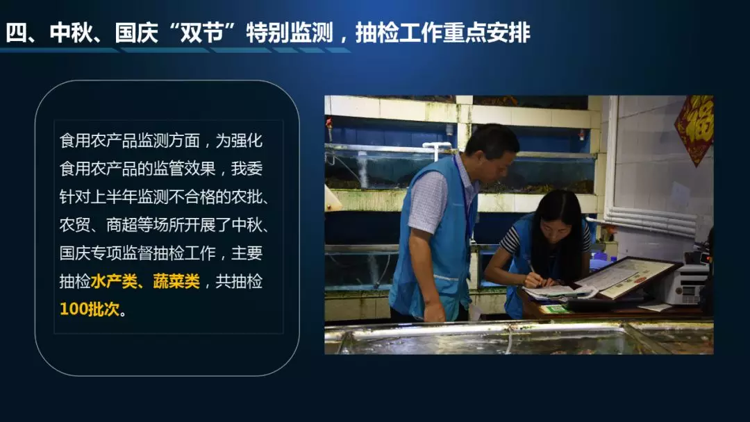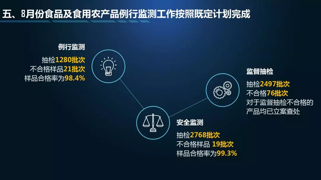 第二個(gè)“3”是三項(xiàng)檢測結(jié)果通報(bào),分別是中秋、國慶的特別監(jiān)測通報(bào),8月份食品例行監(jiān)測通報(bào),8月份食用農(nóng)產(chǎn)品例行監(jiān)測通報(bào);