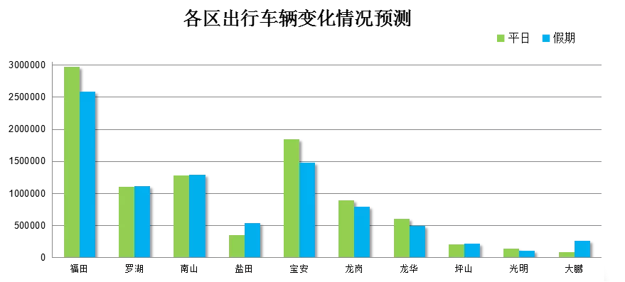 除以上兩個(gè)區(qū)域外,我市其余各區(qū)車(chē)輛會(huì)較平日有所下降,而原關(guān)外的福田、寶安、龍崗,出行車(chē)輛數(shù)下降較為明顯,整體來(lái)看,全市出行車(chē)輛數(shù)將減少6%。