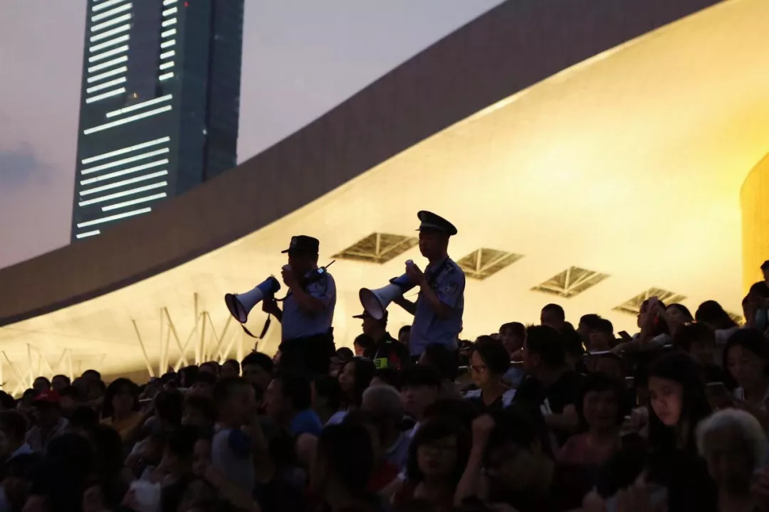燈光秀表演持續(xù)時間長,參加安保工作的警力從17點到23點的6個小時里,始終處于工作狀態(tài),由于人流量每天都近20萬人次,工作強度之大難以想象,但他們毫無怨言堅守崗位,一刻不停地穿梭于人群中,民警和隊員用人墻隔離出一條條通道,身挎大喇叭,全力疏散引導(dǎo),維護現(xiàn)場秩序。在各個出入口、疏散通道、地鐵口、公交站臺等人流密集點都能看到他們忙碌的身影。