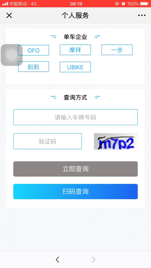 提交完手機號和驗證碼之后,我們就來到了這個頁面,在這里,你可以選擇你要查詢的共享單車的品牌,品牌選擇完畢后,你可以選擇手動輸入車牌號碼或掃碼查詢!