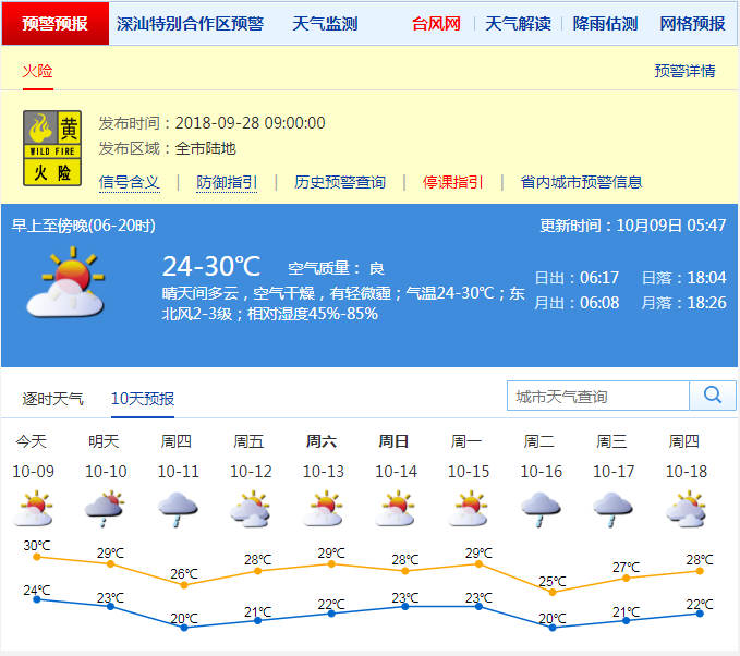 深圳新聞網(wǎng)訊 鵬城昨日持續(xù)晴朗干燥的天氣,局部出現(xiàn)零星小雨。市氣象臺(tái)預(yù)測(cè),今日維持晴好天氣,明起受冷空氣影響,偶有小雨,氣溫回落。近來(lái)天氣持續(xù)干燥,市民應(yīng)注意防火安全。