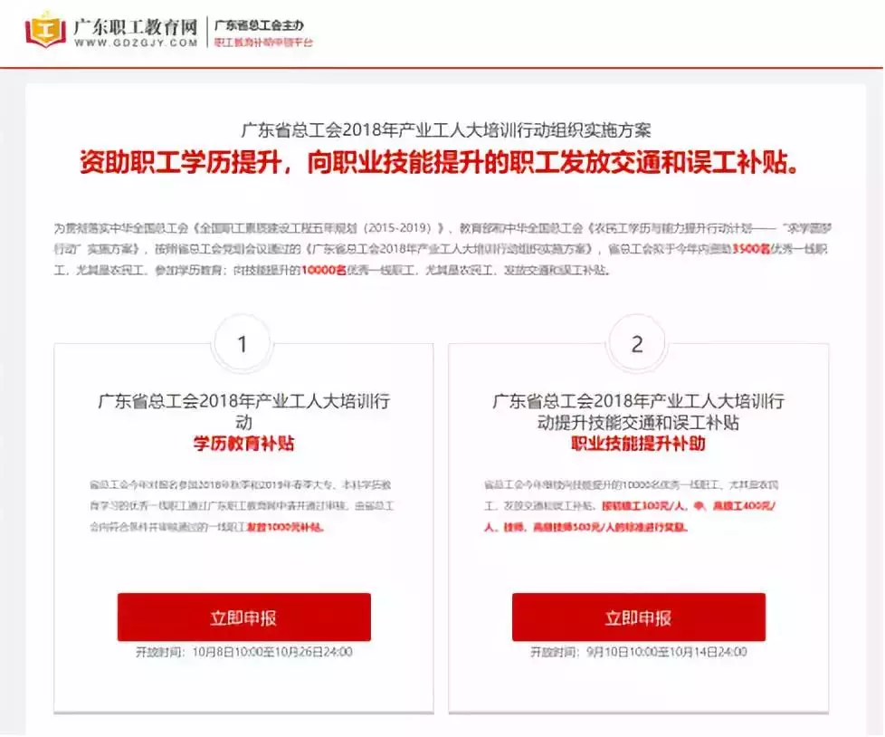 在網(wǎng)站(www.gdzgjy.com)首頁左側(cè)【申報與補貼申領(lǐng)入口】,點擊“廣東省總工會產(chǎn)業(yè)工人大培訓(xùn)學(xué)歷、職業(yè)補貼申領(lǐng)”界面,選擇右側(cè)“職業(yè)技能提升補助”點擊【進入申領(lǐng)】。