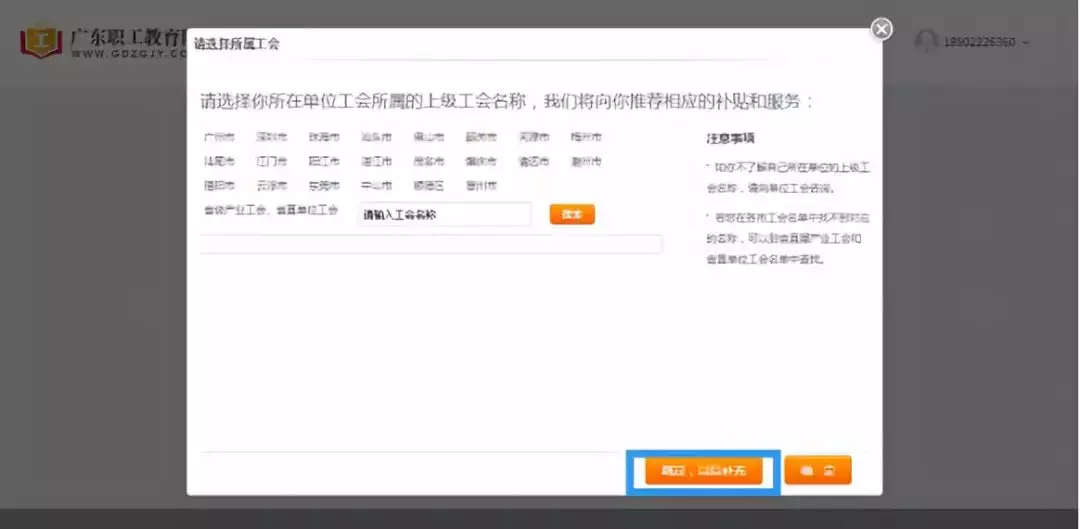 1.進入個人中心頁面,系統(tǒng)自動彈出工會所屬窗口,選擇所屬工會,如仍未確定所屬工會,可點擊【跳過,以后補充】;如已確定所屬工會,請選擇所屬工會,點擊【確定】;