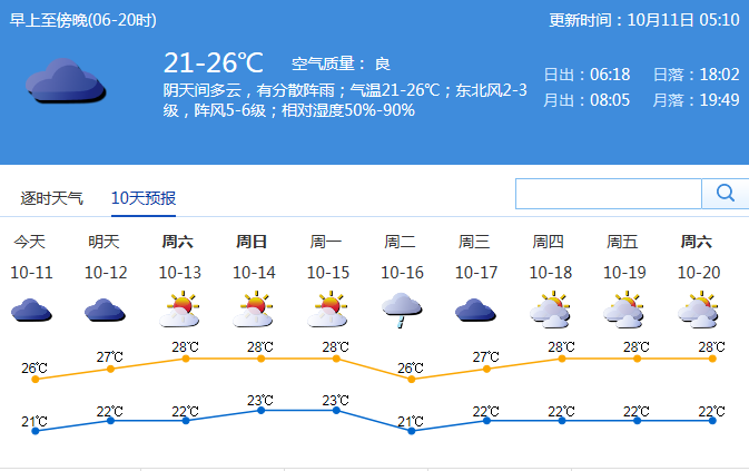 受弱冷空氣影響,預(yù)計(jì)11~12日有分散小雨,其中11日氣溫20 ℃ ~27 ℃。12日持續(xù)陰天,有分散陣雨,氣溫21 ℃ ~27 ℃。預(yù)計(jì)此次弱冷空氣影響持續(xù)到周末,13~15日晴天到多云,氣溫開始回升。16日將有新一輪冷空氣進(jìn)入深圳,有一次降雨過程。