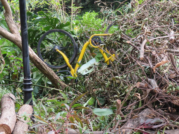 與廢棄樹枝堆成一團的共享單車 深圳論壇網友“noelam”攝