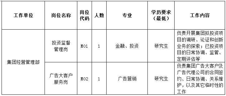專業(yè)方向:人力資源、財務(wù)管理、物業(yè)管理、工商管理、會計學、經(jīng)濟、金融、法學、市場營銷、國際貿(mào)易等相關(guān)專業(yè)。心有鴻鵠,內(nèi)外兼修,正想一展雄才、運營帷幄,靜候你來揭榜……