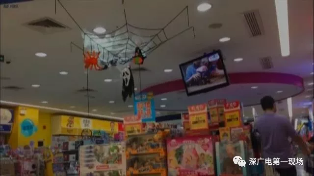 溜冰場(chǎng)工作人員:“就是萬圣節(jié)鬼節(jié)嘛,掛這些東西小孩們可開心了,還有小孩爬上去拽那些玩意,不會(huì)嚇到的,來滑冰的顧客臉上都會(huì)化妝扮鬼?!?/p> 玩具賣場(chǎng)萬圣節(jié)道具花樣多 魔鬼面具熱銷