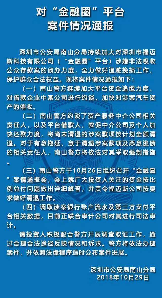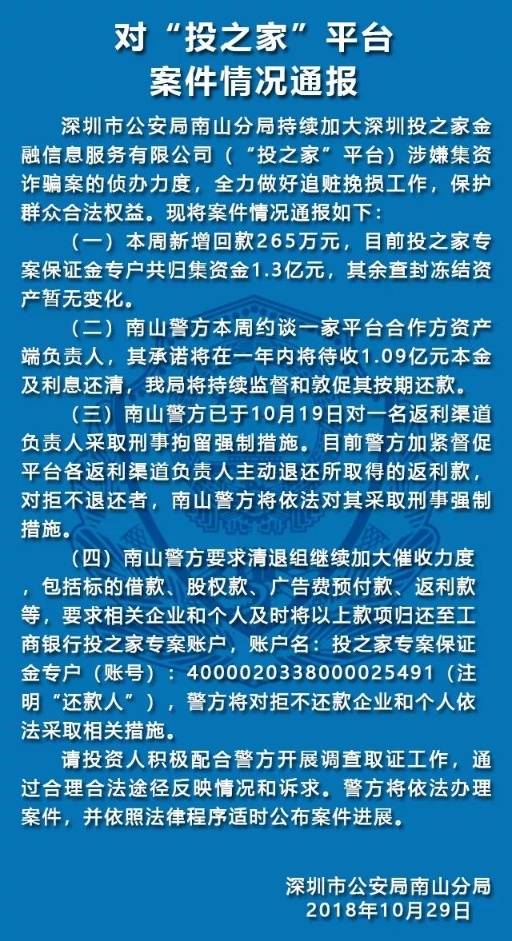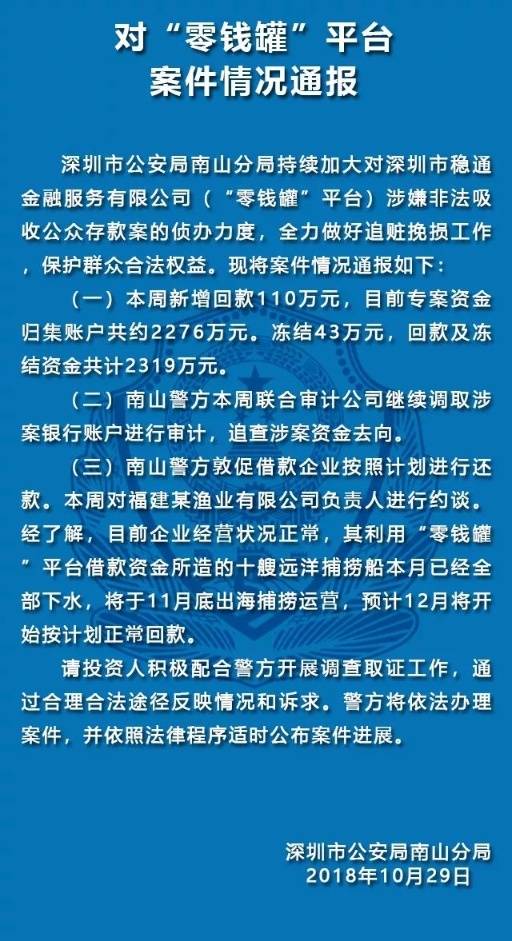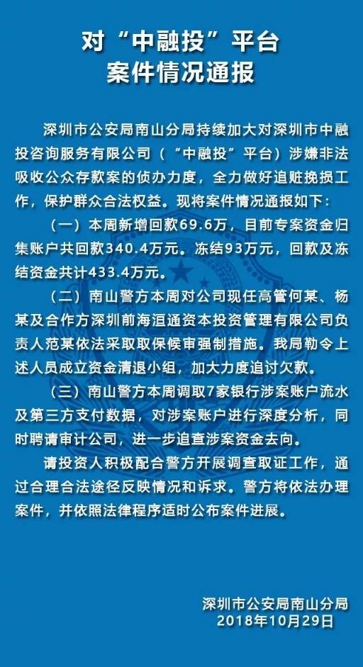 10月29日,深圳南山公安通報(bào)五家涉嫌非法集資犯罪的P2P平臺(tái)案件情況。五家平臺(tái)分別是“中融投”“投之家”“零錢(qián)罐”“利民網(wǎng)”“金融圈”平臺(tái)。