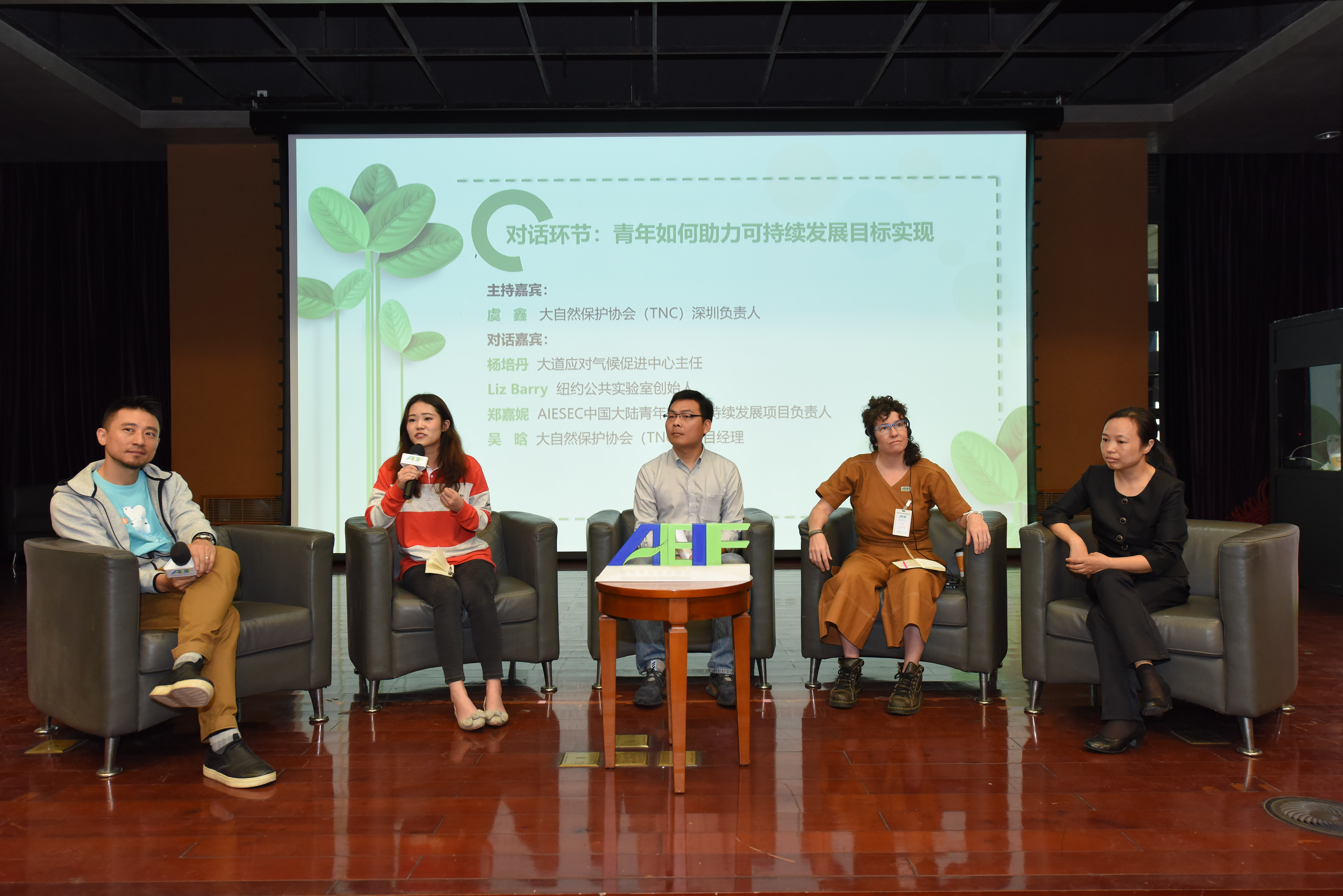 對(duì)話環(huán)節(jié)“青年如何助力可持續(xù)發(fā)展目標(biāo)實(shí)現(xiàn)”共有6位嘉賓參與。在主持嘉賓大自然保護(hù)協(xié)會(huì)(TNC)深圳保護(hù)項(xiàng)目負(fù)責(zé)人虞鑫先生的帶領(lǐng)下,大道應(yīng)對(duì)氣侯促進(jìn)中心主任楊培丹、紐約公共實(shí)驗(yàn)室創(chuàng)始人Liz Barry、AIESEC中國(guó)大陸青年獻(xiàn)力可持續(xù)發(fā)展項(xiàng)目負(fù)責(zé)人鄭嘉妮、大自然保護(hù)協(xié)會(huì)(TNC)項(xiàng)目經(jīng)理吳晗參與了分享交流。
