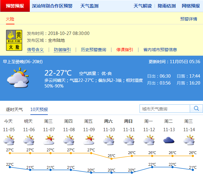 5日,深圳將以多云天氣為主,部分時間可見陽光。白天氣溫回升,最高氣溫在27度左右。早晚天氣清涼,最低氣溫在22度左右,溫差增大,市民應(yīng)注意預(yù)防疾病。