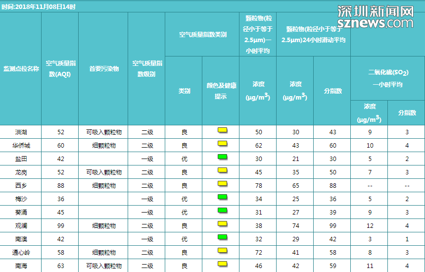 深圳市人居環(huán)境委員會于2018年11月8日14時發(fā)布空氣質(zhì)量時報