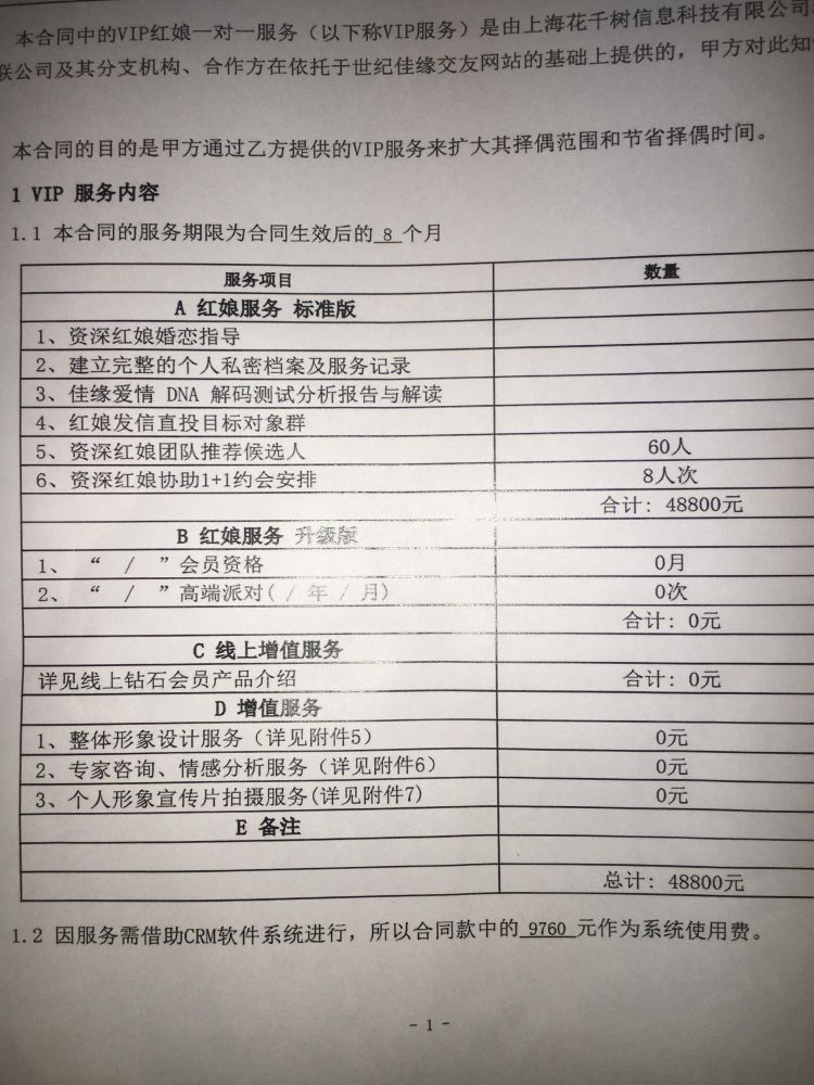 今年2月27日,劉小姐與世紀(jì)佳緣簽訂了一份繳款4.88萬的紅娘服務(wù)合同。合同服務(wù)期限為8個月,合同將根據(jù)其擇偶標(biāo)準(zhǔn),由系統(tǒng)推薦60位候選人,其中紅娘協(xié)助線下約會安排8人次。此外,合同還包含三項(xiàng)增值服務(wù),包括整體形象設(shè)計(jì),專家咨詢、情感分析服務(wù)和個人宣傳片服務(wù)。