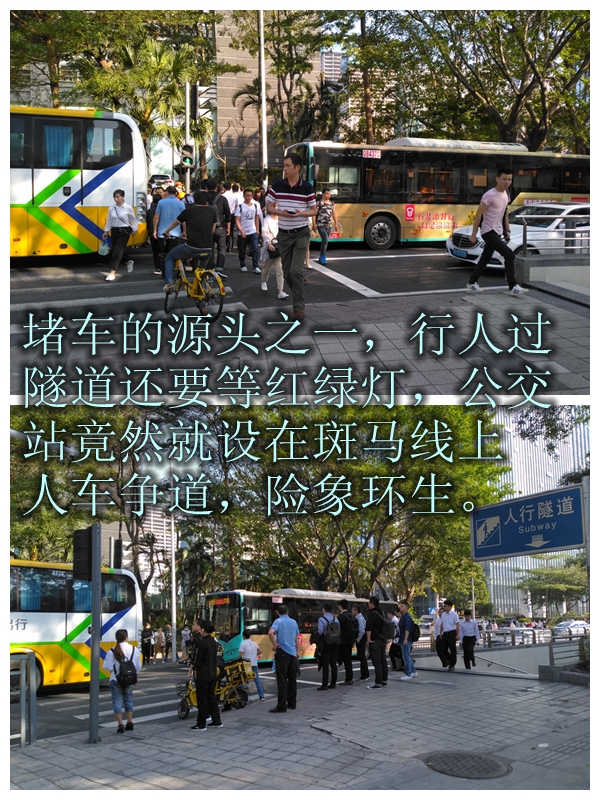 而在進入人行隧道前,又需要等紅綠燈,且公交車站就設在這紅綠燈前的斑馬線上?!拔也幻靼诪楹卧诮煌ㄟ@樣混亂的地方,要設置公交車站,也不知為何‘為難’的都是市民。”網(wǎng)友“深圳大胡子”為這里每天通行的行人鳴不平,他希望能把招商銀行公交站原來的港灣式站臺恢復,方便市民乘車,也希望能盡快恢復正常的過街通道。
