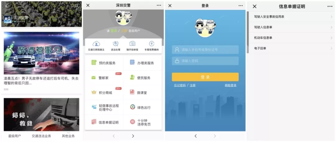 搜索公眾號(hào)“深圳交警” →登錄星級(jí)用戶 →選擇“信息單據(jù)證明” →選擇需要打印的證明類型