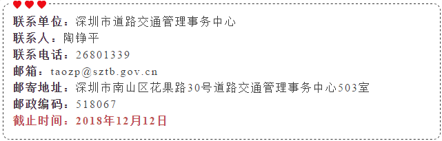 根據(jù)《深圳市機(jī)動車道路臨時(shí)停放管理辦法》相關(guān)規(guī)定,市交委現(xiàn)就以上18條道路路邊停車泊位設(shè)置方案公開征求意見。市民如有意見和建議,可于2018年12月12日前反饋給市交委。郵寄地址為深圳市南山區(qū)花果路30號道路交通管理事務(wù)中心503室。
