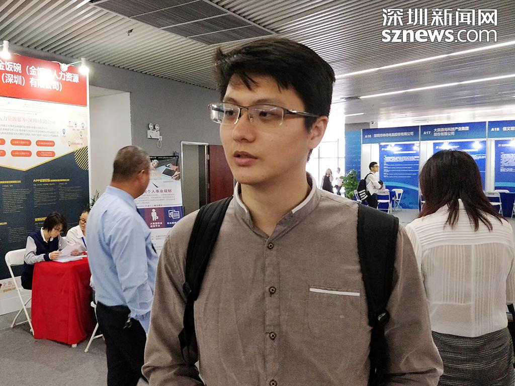 現(xiàn)場應(yīng)聘的劉先生已有一年的工作經(jīng)驗(yàn),此次高端人才招聘會的信息是通過深圳市人力資源社會保障局的微信公眾號得知,故來到現(xiàn)場希望尋得一個對口的崗位。