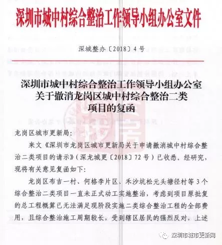 事實(shí)上,早在2018年7月,龍崗區(qū)城市更新局就已經(jīng)依據(jù)相關(guān)規(guī)定要求,批復(fù)取消這幾個城中村實(shí)施綜合整治的申請,并予以公示。此次的批復(fù)公告實(shí)際為區(qū)城市更新局向上級城中村綜合整治領(lǐng)導(dǎo)和決策機(jī)構(gòu)(深城整辦)的請示文件所反饋的意見復(fù)函。