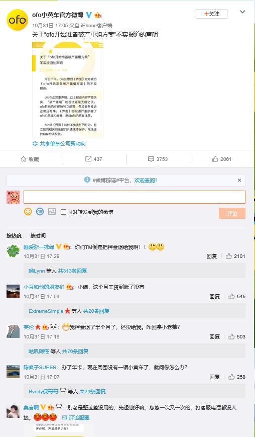 今年10月底,《界面》新聞發(fā)布題為《ofo開始準備破產(chǎn)重組方案》的報道。當日,ofo官微稱該報道嚴重失實,將訴諸法律維護自身合法權(quán)益。