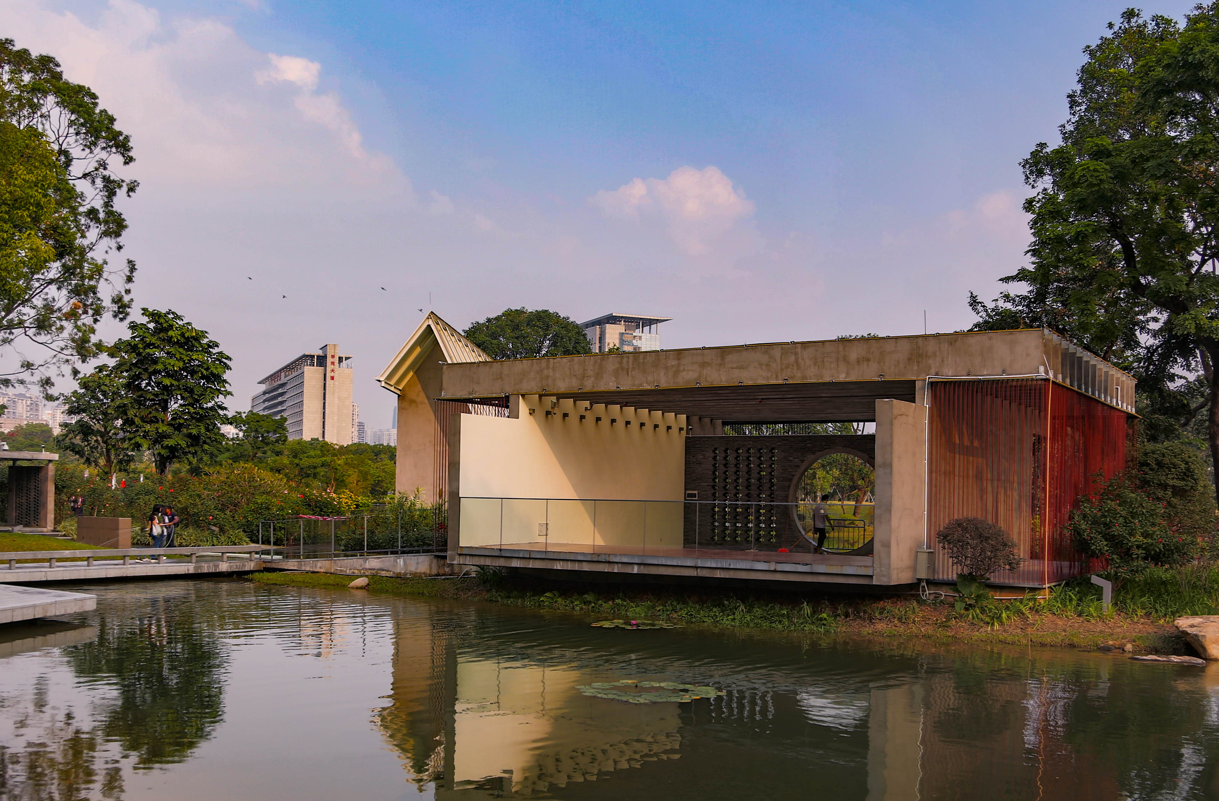 在湖對(duì)岸遠(yuǎn)望兩座風(fēng)格迥異的中西式婚姻禮堂。
