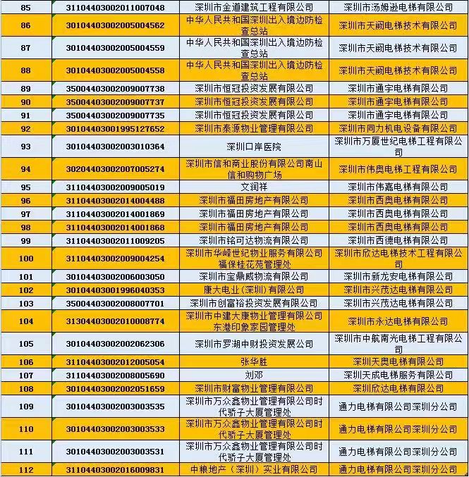 不合格電梯維保單位為:深圳市誠禾機電設(shè)備有限公司;深圳市通宇電梯有限公司;深圳市安眾電梯工程有限公司;深圳市蓉奧電梯有限公司;清遠(yuǎn)市中日富士電梯有限公司;富士通(深圳)有限公司。