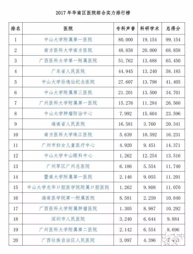 華南區(qū)域醫(yī)院前20名有14家位于廣州