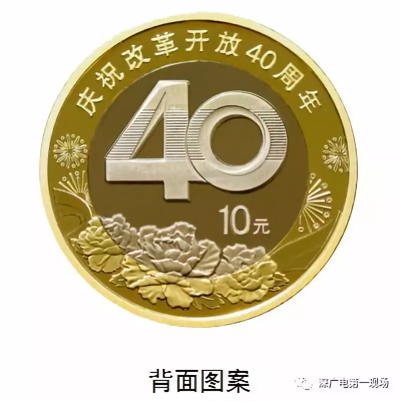 背面圖案為數(shù)字“40”造型與牡丹花組合設計,并刊“慶祝改革開放40周年”字樣及面額。