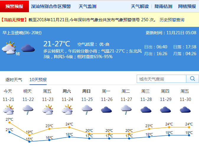 市氣象局預(yù)計,20日17-20時,深圳市以多云天氣為主;氣溫在22-25℃;相對濕度65%-85%;偏北風3-4級,陣風5-6級;全市能見度大部分地區(qū)在10公里以上。傍晚天氣舒適,適合戶外運動。21日夜間至22日冷空氣影響,有小雨,北風加大,沿海和高地最大陣風7-8級,22日最低氣溫會降至15℃左右;23-24日晴天間多云,氣溫回升;25-26日,陰天有陣雨。