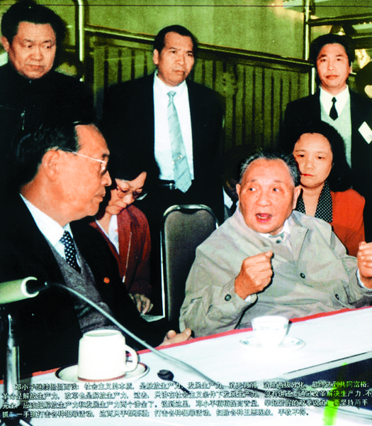 1992年1月20日,小平同志登上國(guó)貿(mào)大廈旋轉(zhuǎn)餐廳,聽(tīng)取時(shí)任市委書記李灝的匯報(bào)并發(fā)表談話。(
