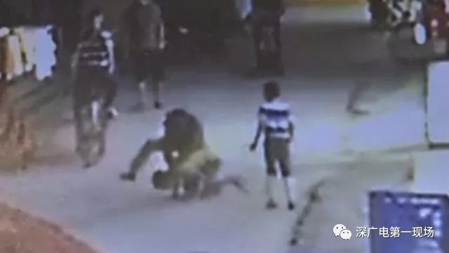 將小月按倒在地后,一名成年男子對著孩子的頭部打了五拳,看到圍觀市民越來越多,男子帶著身邊的男孩離開。