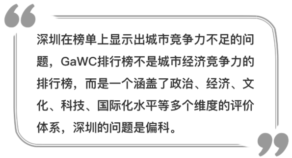 從GaWC發(fā)布的榜單和評(píng)價(jià)體系可以看出,深圳雖然在經(jīng)濟(jì)實(shí)力和經(jīng)濟(jì)總量上已經(jīng)取得了較大發(fā)展,但城市國際綜合競爭力尤其是城市軟實(shí)力還存在明顯差距,“偏科”的現(xiàn)象仍然沒有改變。