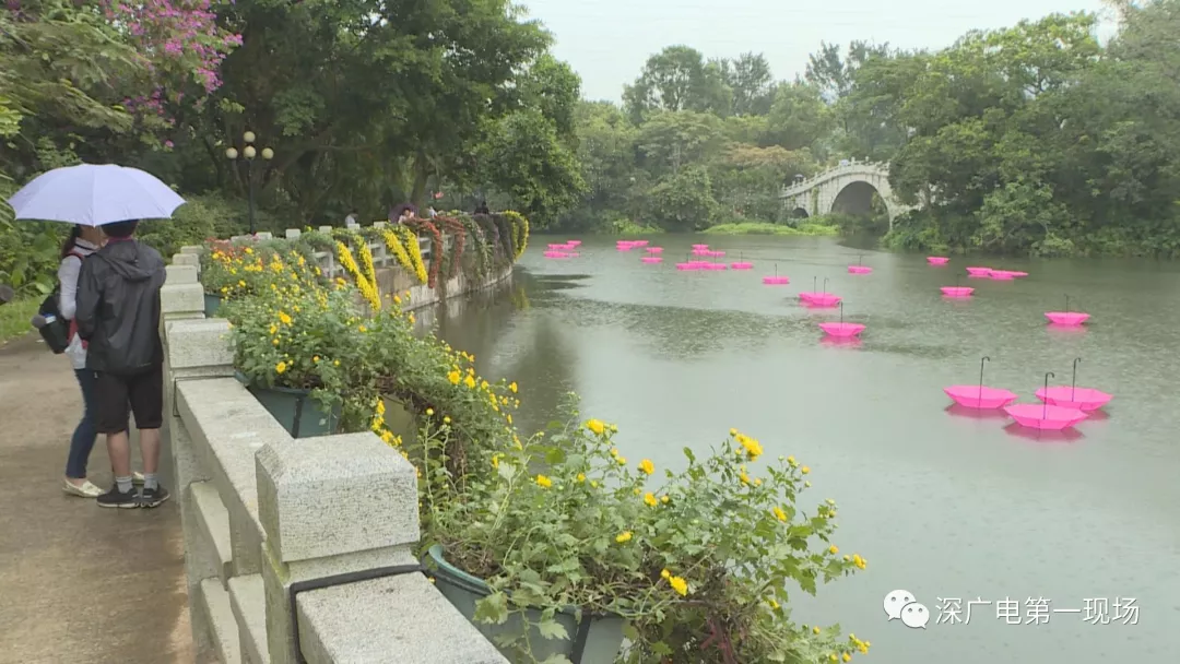 為了讓市民感受到這種小別重逢的驚喜,公園方面準(zhǔn)備了很多新的創(chuàng)意,在沿湖步道布置了400盆懸崖菊,像孔雀尾羽一般垂向水面,湖面上三三兩兩漂浮著粉紅色的雨傘,在雨絲中倒映著湖光山色,別有一番詩情畫意。