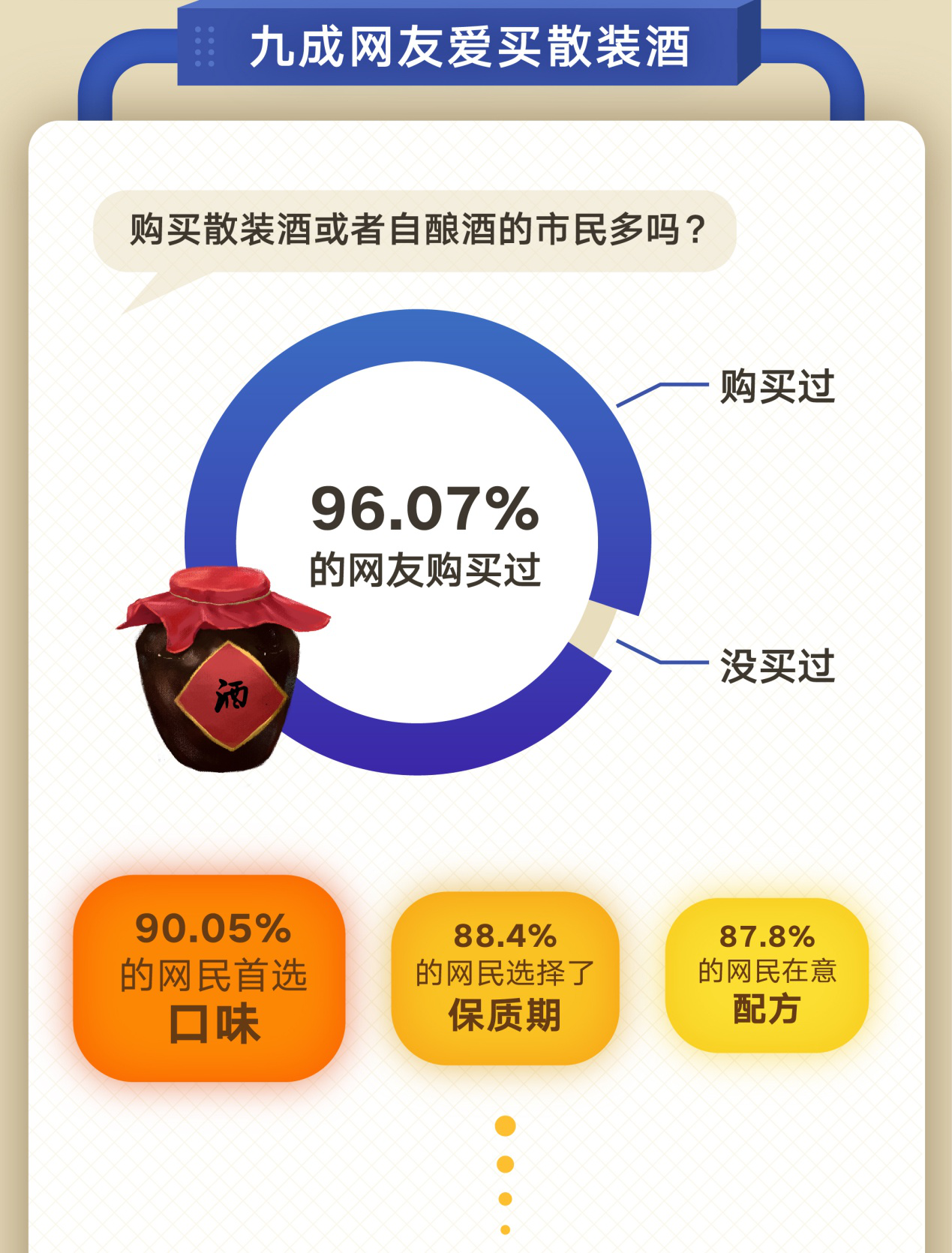 在深圳,購買散裝酒或者自釀酒的市民多嗎?根據(jù)此次調(diào)查數(shù)據(jù)顯示,高達(dá)96.07%的網(wǎng)友都曾購買過,可見散裝酒和自釀酒的受歡迎程度。 買散裝酒最看重什么?調(diào)查數(shù)據(jù)顯示,90.05%的網(wǎng)民首選口味;88.4%的網(wǎng)民選擇了保質(zhì)期;87.8%的網(wǎng)民在意配方,而對安全性關(guān)注的只有7.95%。
