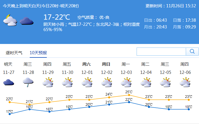 市氣象局發(fā)布未來十天天氣預報(數據更新于11月26日15時32分)