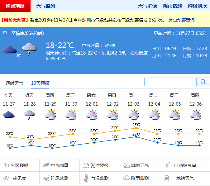 市氣象臺預測,29日零星小雨轉多云,可見陽光。30日到12月1日陰天間多云,偶有零星小雨;2到3日,多云,可見陽光。