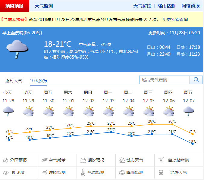 深圳新聞網(wǎng)11月28日訊(記者 陳婕)深圳的平均入秋日是11月3號(hào),而今年是11月22日,屬歷史第二晚。既然入了秋,就要有秋天的樣子,在這種太陽(yáng)休年假的時(shí)候,氣溫是很難升高的,不過(guò)我知道你們也不想要升溫,12月中旬的那波冷空氣可能會(huì)讓你更滿意。目前雷達(dá)回波還主要在海上,秋雨綿綿,預(yù)計(jì)28日還會(huì)有一些零散回波“飄”過(guò)來(lái),以分散性的小雨為主。