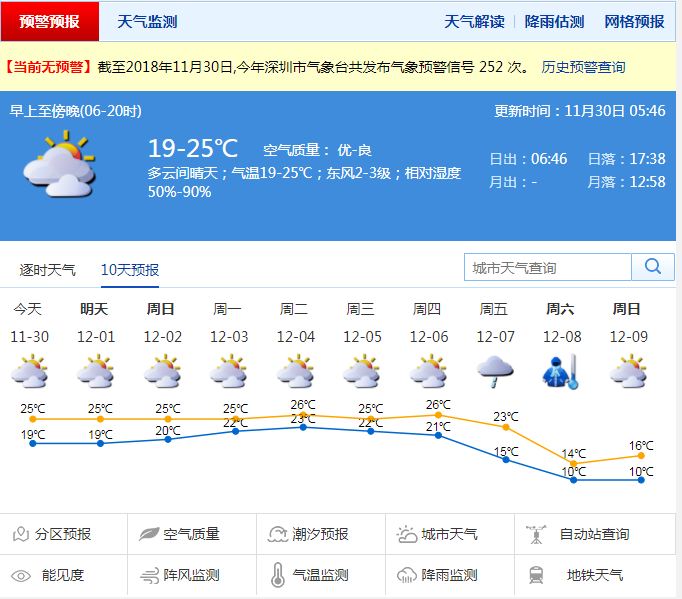 深圳新聞網(wǎng)11月30日訊(記者 施冰冰)29日多云間晴天;18-25℃;東風(fēng)2-3級;濕度50%-90%。12月1-2日多云可見陽光,早晚有輕霧;3-6日多云間陰天,偶有零星小雨。展望7-8日,受冷空氣影響,北風(fēng)明顯增大,天氣轉(zhuǎn)冷。