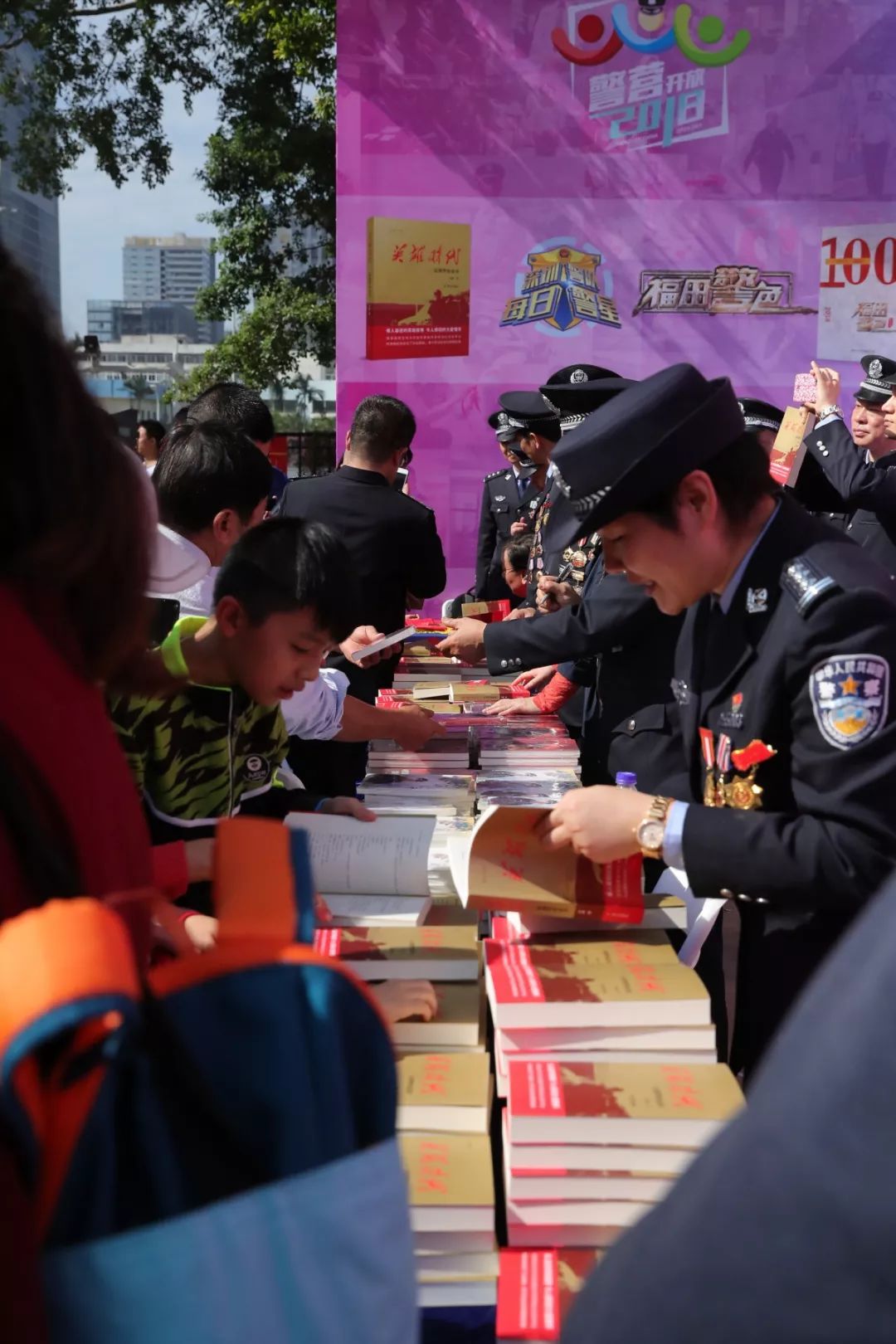 當(dāng)天上午,人民公安出版社副總編李國(guó)強(qiáng)、著名作家李迪與市公安局領(lǐng)導(dǎo)來(lái)到福田分局開放點(diǎn)現(xiàn)場(chǎng)為深圳公安“每日警星”代表簽名贈(zèng)書。在贈(zèng)書點(diǎn),許多市民排起了長(zhǎng)隊(duì),領(lǐng)取《英雄時(shí)代——深圳警察故事》。