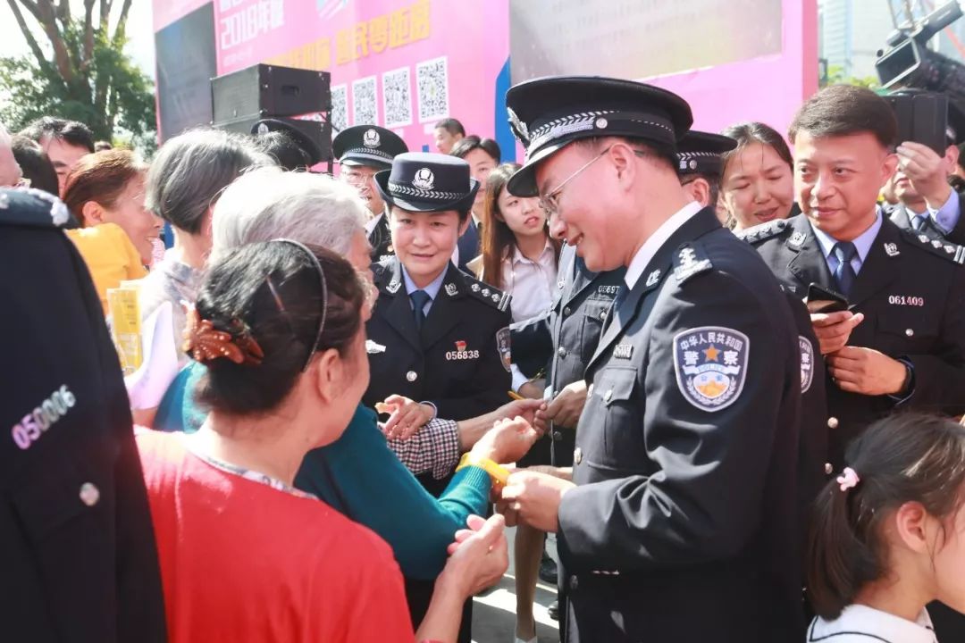 儀式后,深圳市副市長(zhǎng)、公安局長(zhǎng)徐文?,F(xiàn)場(chǎng)為來(lái)參觀活動(dòng)的老人和小孩佩戴了“黃手環(huán)”,陽(yáng)光的顏色,給人溫暖,讓人安心,傳遞了正能量。