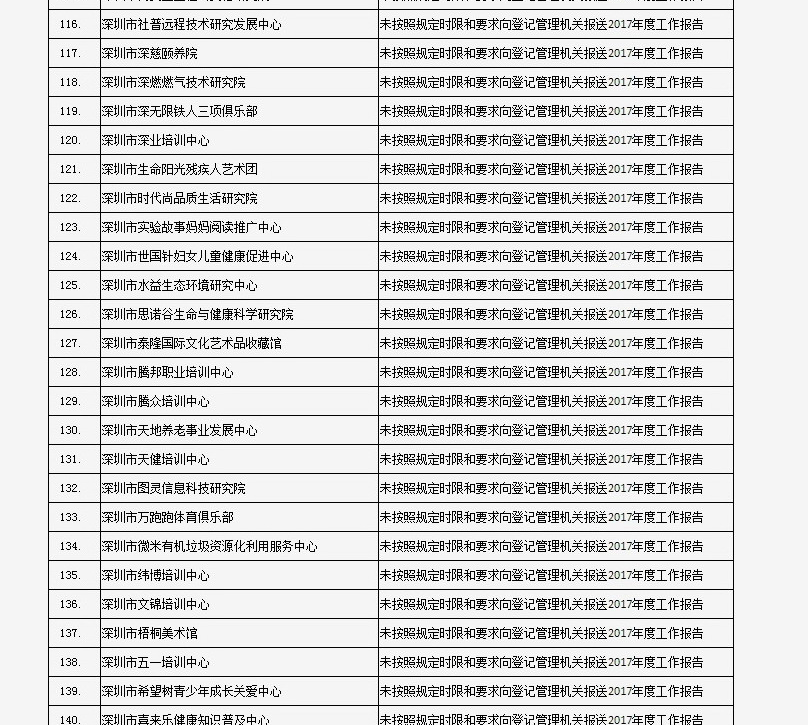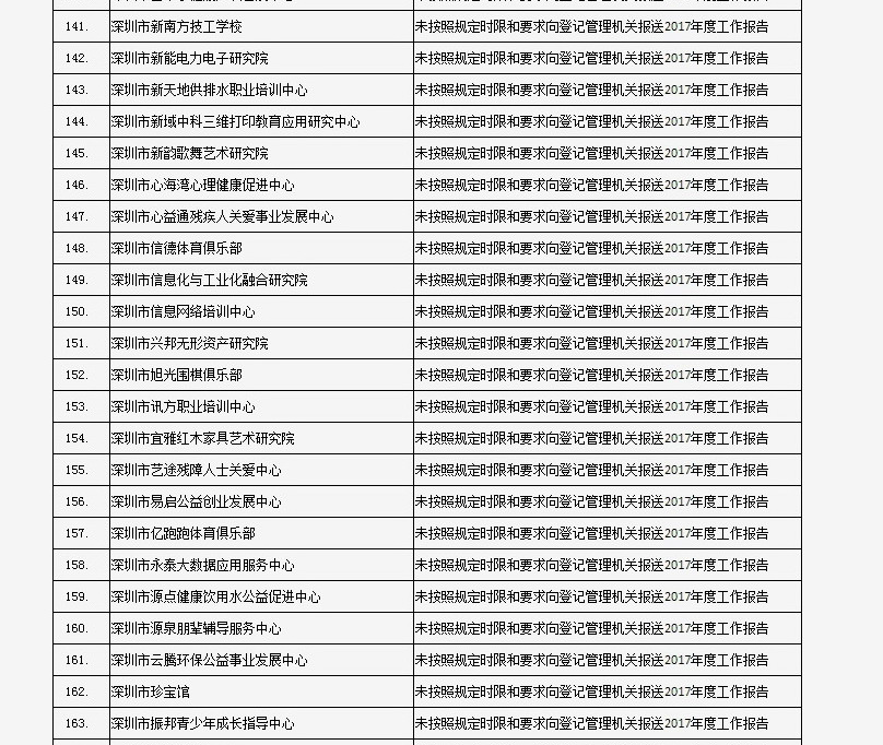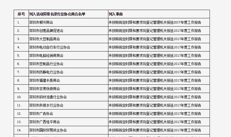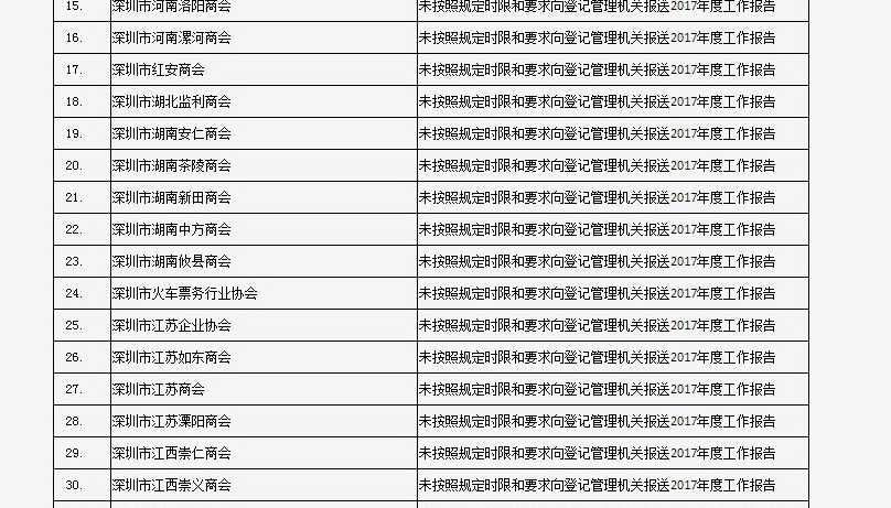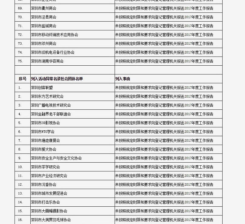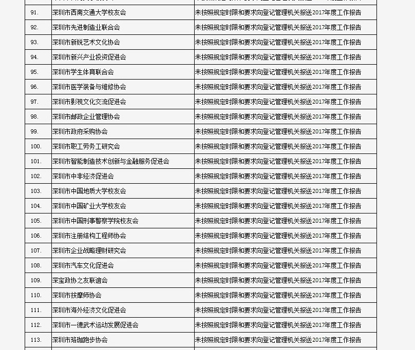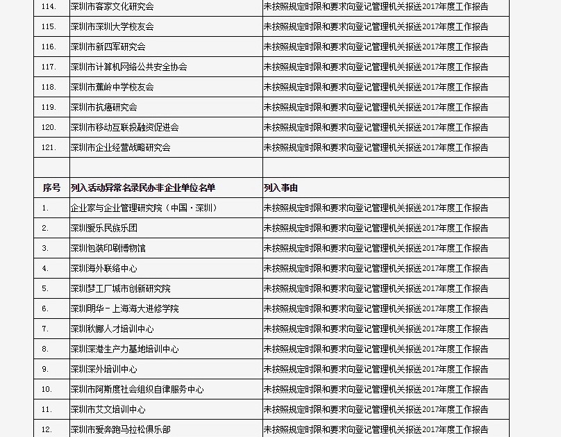 據(jù)深圳市民政局通報,深圳市華中科技大學(xué)校友會和深圳市深圳大學(xué)校友會等121家社會團體、深圳市郴州商會等75家行業(yè)協(xié)會商會、企業(yè)家與企業(yè)管理研究院(中國·深圳)等201家民辦非企業(yè)單位、深圳市明園慈善基金會等20家基金會,經(jīng)查“未按照規(guī)定時限和要求向登記管理機關(guān)報送2017年度工作報告”,違反了《社會組織信用信息管理辦法》《深圳經(jīng)濟特區(qū)行業(yè)協(xié)會條例》的相關(guān)規(guī)定,被列入活動異常名錄名單。完整版名單已在“深圳民政在線”公布。