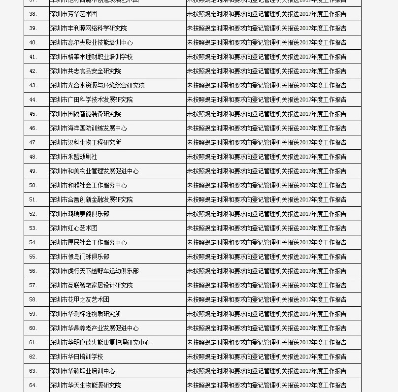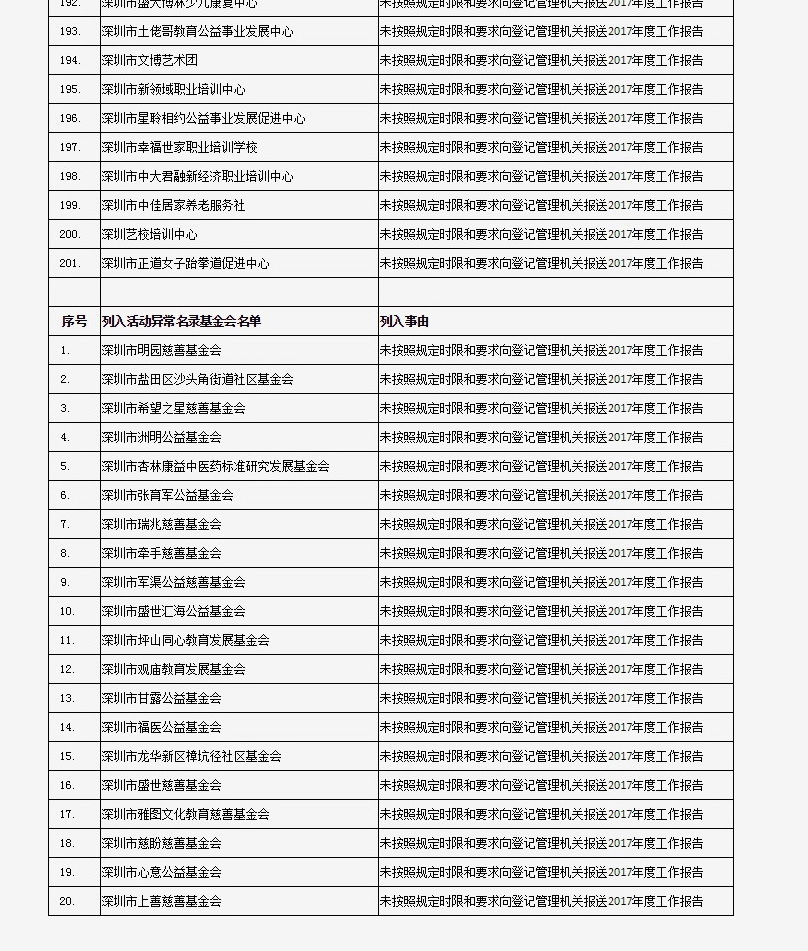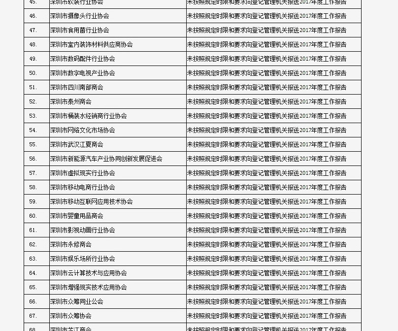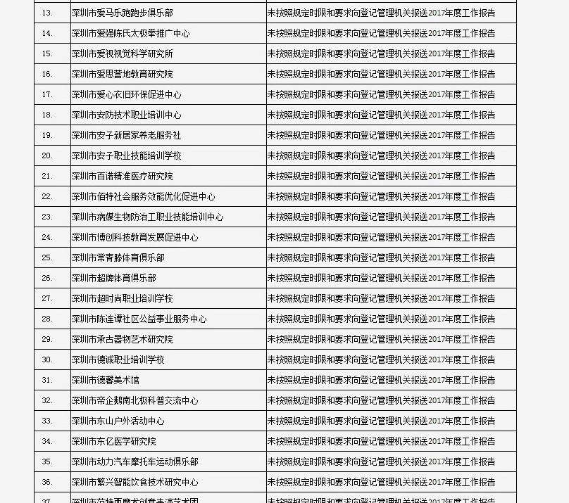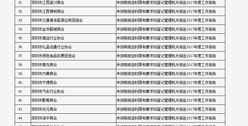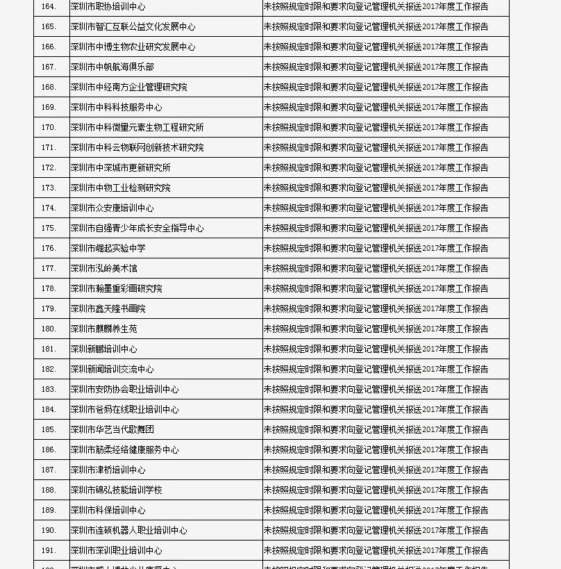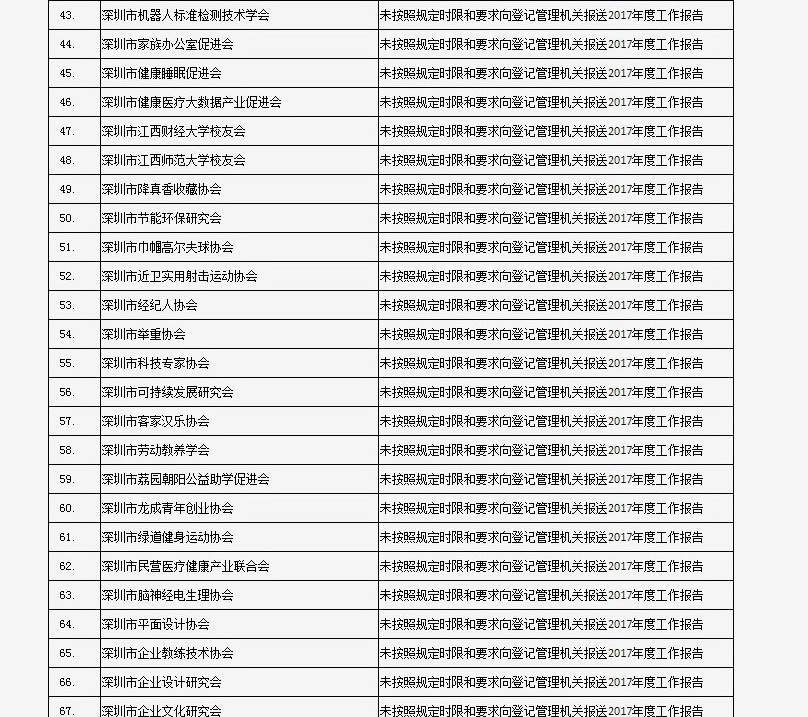 據(jù)深圳市民政局通報,深圳市華中科技大學(xué)校友會和深圳市深圳大學(xué)校友會等121家社會團體、深圳市郴州商會等75家行業(yè)協(xié)會商會、企業(yè)家與企業(yè)管理研究院(中國·深圳)等201家民辦非企業(yè)單位、深圳市明園慈善基金會等20家基金會,經(jīng)查“未按照規(guī)定時限和要求向登記管理機關(guān)報送2017年度工作報告”,違反了《社會組織信用信息管理辦法》《深圳經(jīng)濟特區(qū)行業(yè)協(xié)會條例》的相關(guān)規(guī)定,被列入活動異常名錄名單。完整版名單已在“深圳民政在線”公布。