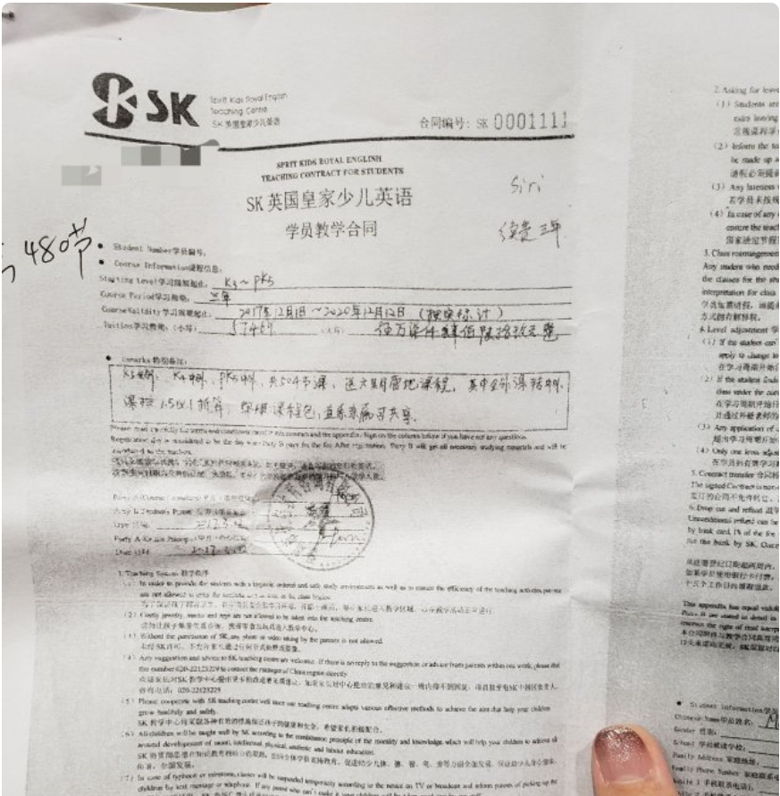 ▲家長提供合同顯示課時(shí)和款項(xiàng)