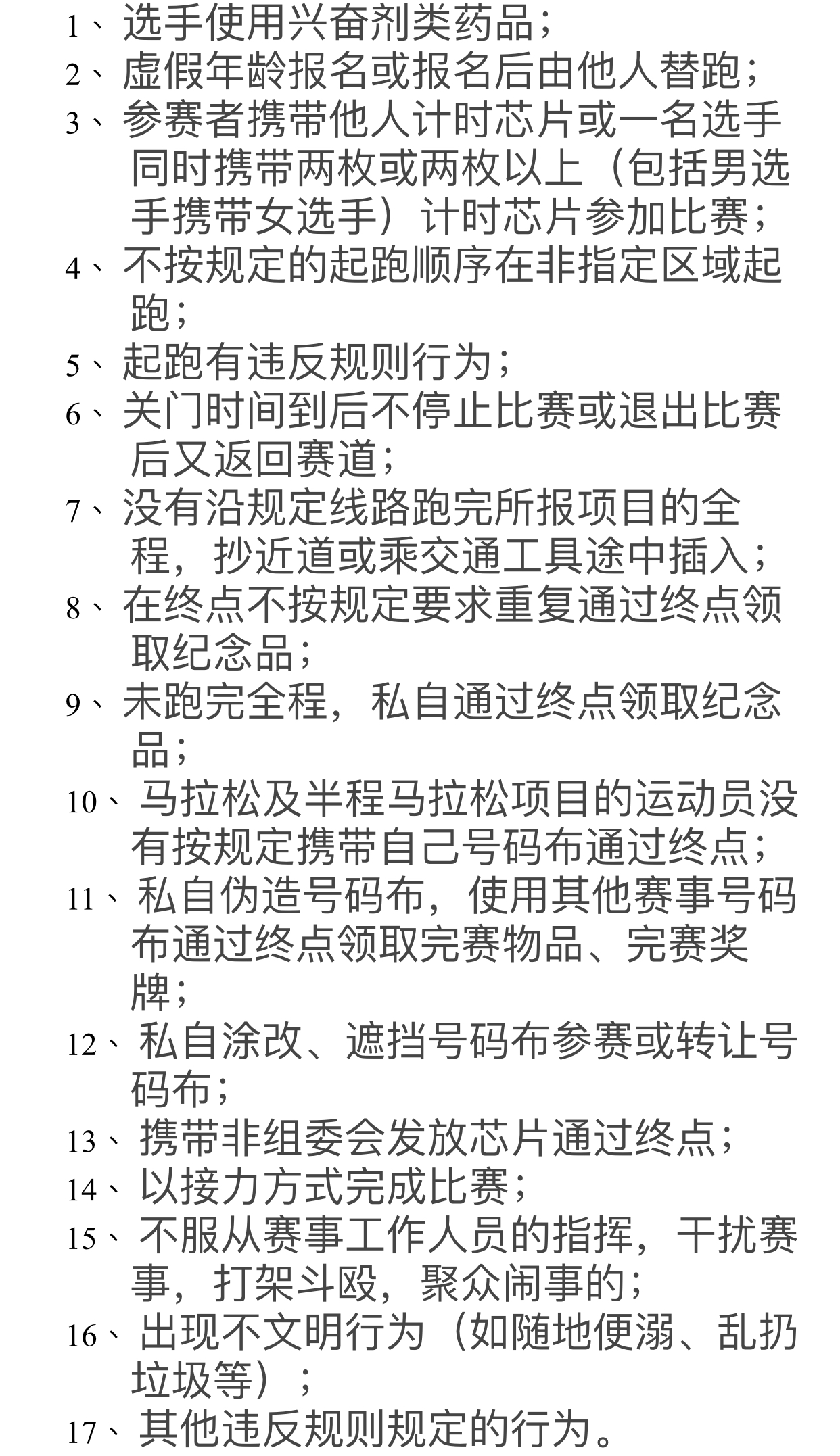 據(jù)悉,在比賽期間選手出現(xiàn)17項(xiàng)違規(guī)行為之一的問題,裁判員有權(quán)中止選手的比賽并當(dāng)場沒收違規(guī)選手的號碼布及芯片,取消其比賽資格,賽后由組委會視情節(jié)輕重分別給予參賽選手取消2018深馬比賽成績、禁賽1至2年,情節(jié)嚴(yán)重者終身禁賽等處罰,并將違規(guī)信息報(bào)送中國田協(xié)申請系列追加處罰。