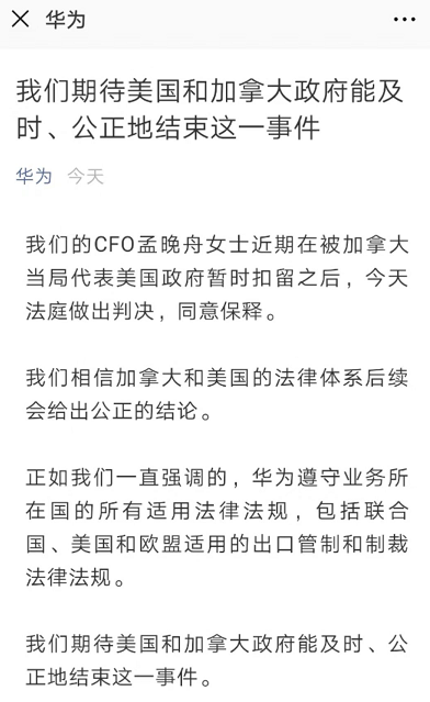 12月12日上午,華為發(fā)布聲明:期待美國和加拿大政府能及時、公正地結(jié)束這一事件