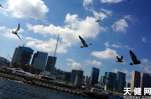 藍(lán)天白云,海風(fēng)拂面,潮水拍岸,海鷗翱翔,東港商務(wù)區(qū)高樓林立,綻放壯觀魅力