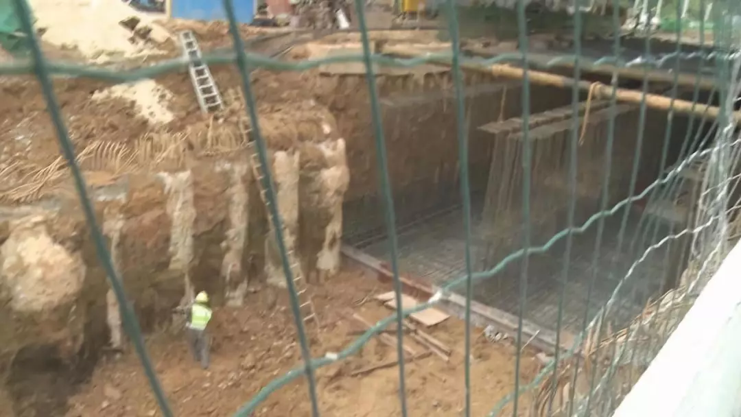 今天記者在現(xiàn)場(chǎng)看見,施工工地為河流拐道的箱涵工程,工地現(xiàn)場(chǎng)高度落差有近10米,目前箱涵只安裝了前期的部分頂板。