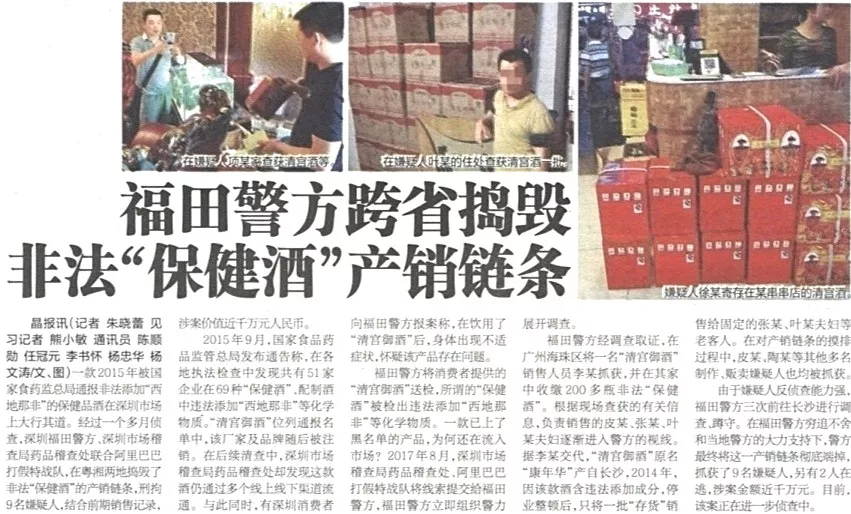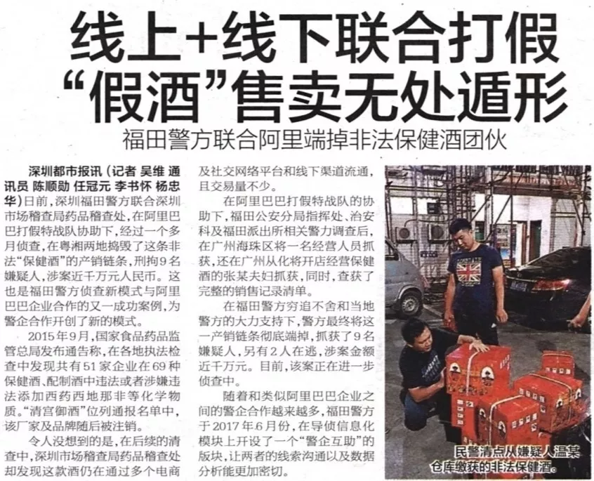 ★★福田警方聯(lián)合深圳市場稽查局藥品稽查處,在阿里巴巴“打假特戰(zhàn)隊”協(xié)助下,經過一個多月偵查,于粵湘兩地搗毀了非法“保健酒”的產銷鏈條,刑拘9名嫌疑人,涉案價值近千萬元人民幣。
