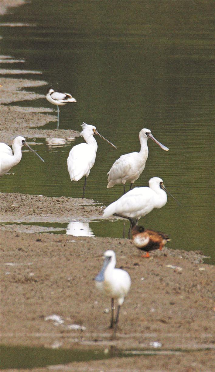 中午12時許,福田紅樹林國家級保護區(qū)的2號魚塘里,已經(jīng)聚集了45只珍稀候鳥——黑臉琵鷺。在它們身邊,還有數(shù)百只反嘴鷸、針尾鴨、綠翅鴨、琵嘴鴨、赤頸鴨、青腳鷸等候鳥在水中忙著覓食。
