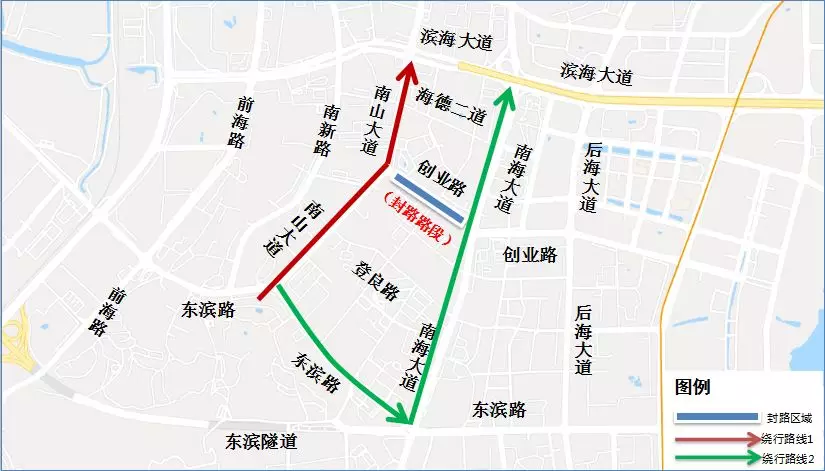 原經(jīng)南山大道轉入創(chuàng)業(yè)路東行,前往南海大道北行的車輛,可改沿南山大道北行,或經(jīng)東濱路轉入南海大道北行。